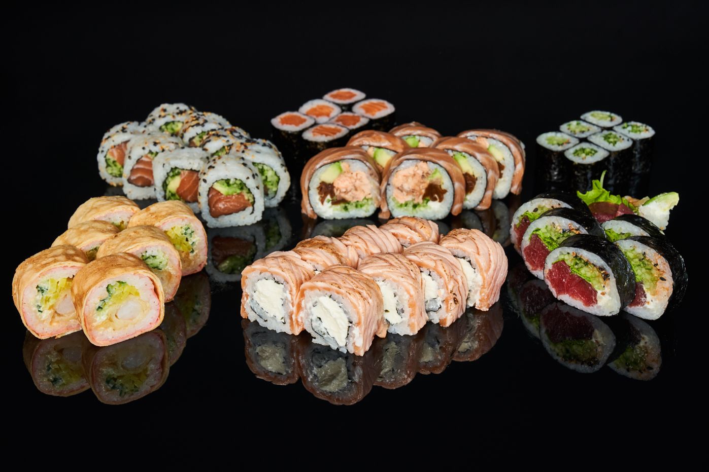 w środku: łosoś, serek, warzywa, na zewnątrz: węgorz, mango, kabayaki, sezam -
