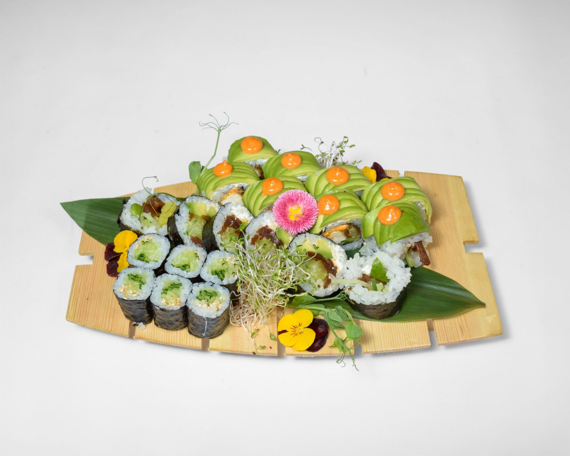 w środku: warzywa w temp, spicy majo, na zewnątrz: awokado, sezam -