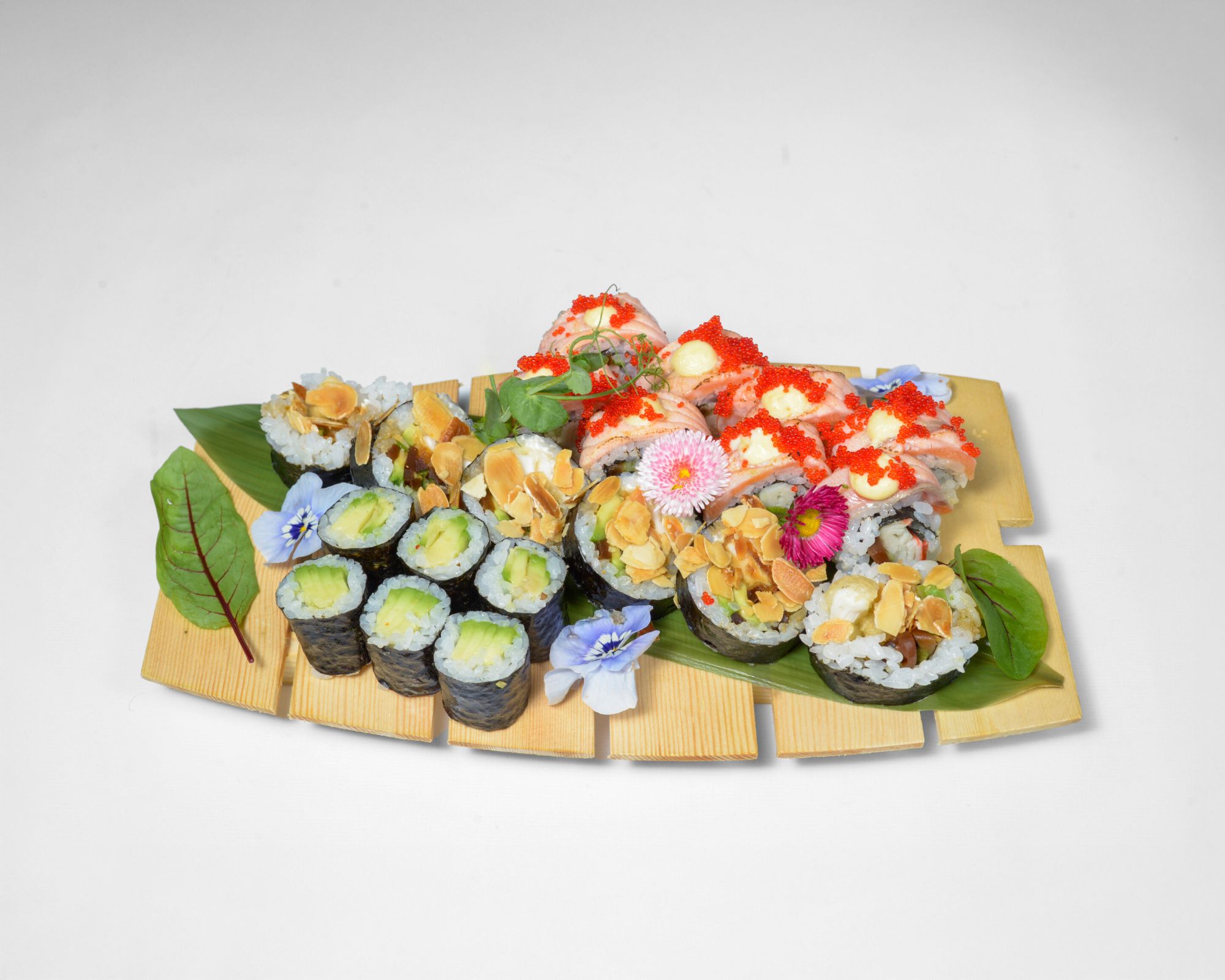 Hosomaki tamago, kabayaki, płatki migdałów