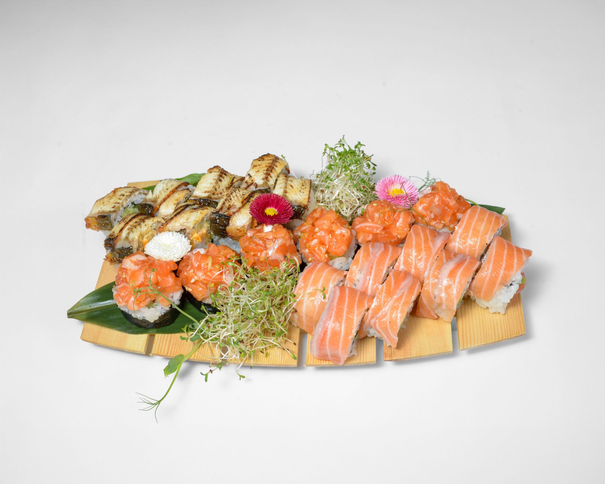 Hosomaki łosoś pieczony, rolka smazona w tempurze z płatkami migdałów, kabayaki