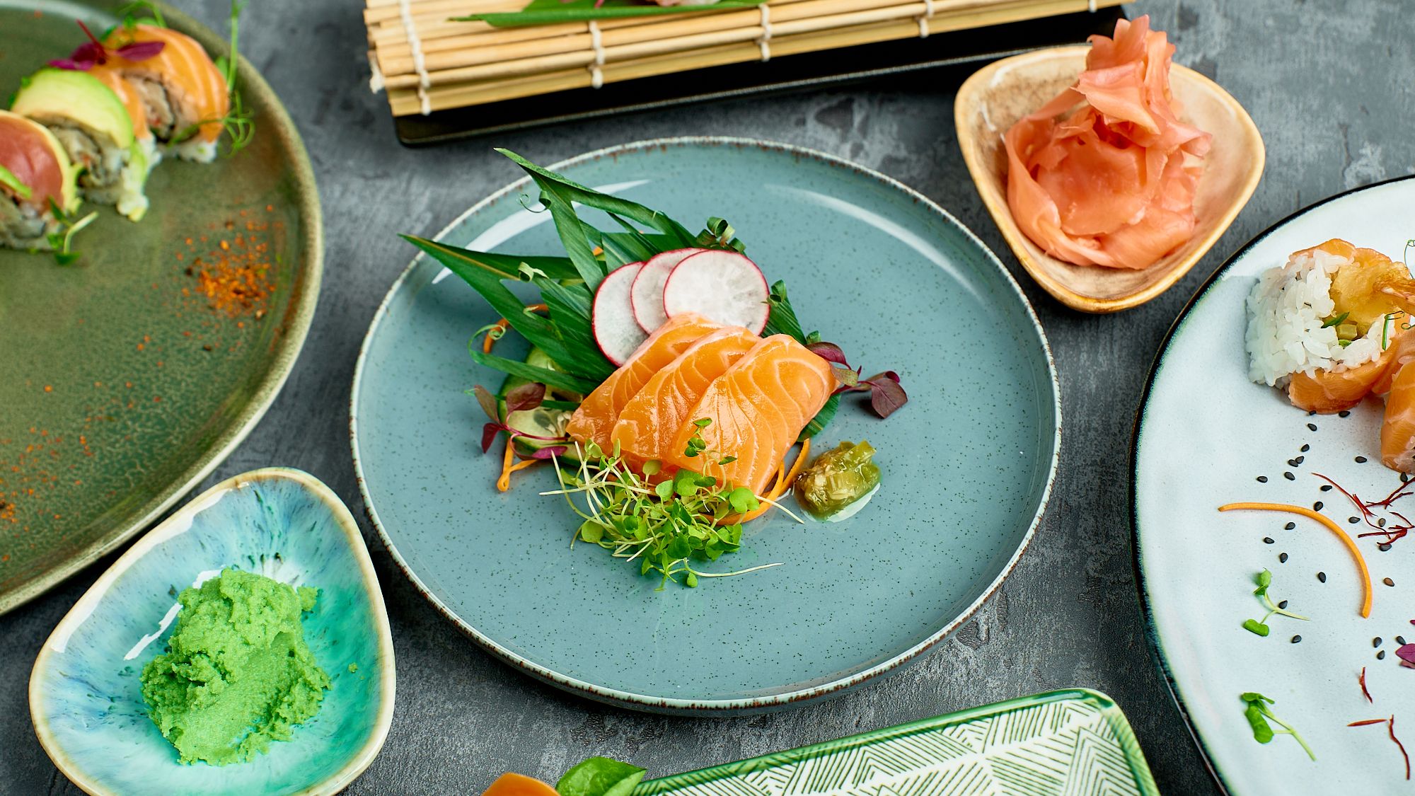 szparagi w tempurze, mango, tatar z łososia, kabayaki, migdały prażone, sezam